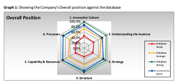 On the other hand, the scores obtained for “Innovative Business Practice” and “Innovative Business Performance” are 83.3% and 75.0% respectively, which means that Graphenstone is also above the average of competitors’ scores for these two aspects of innovation.